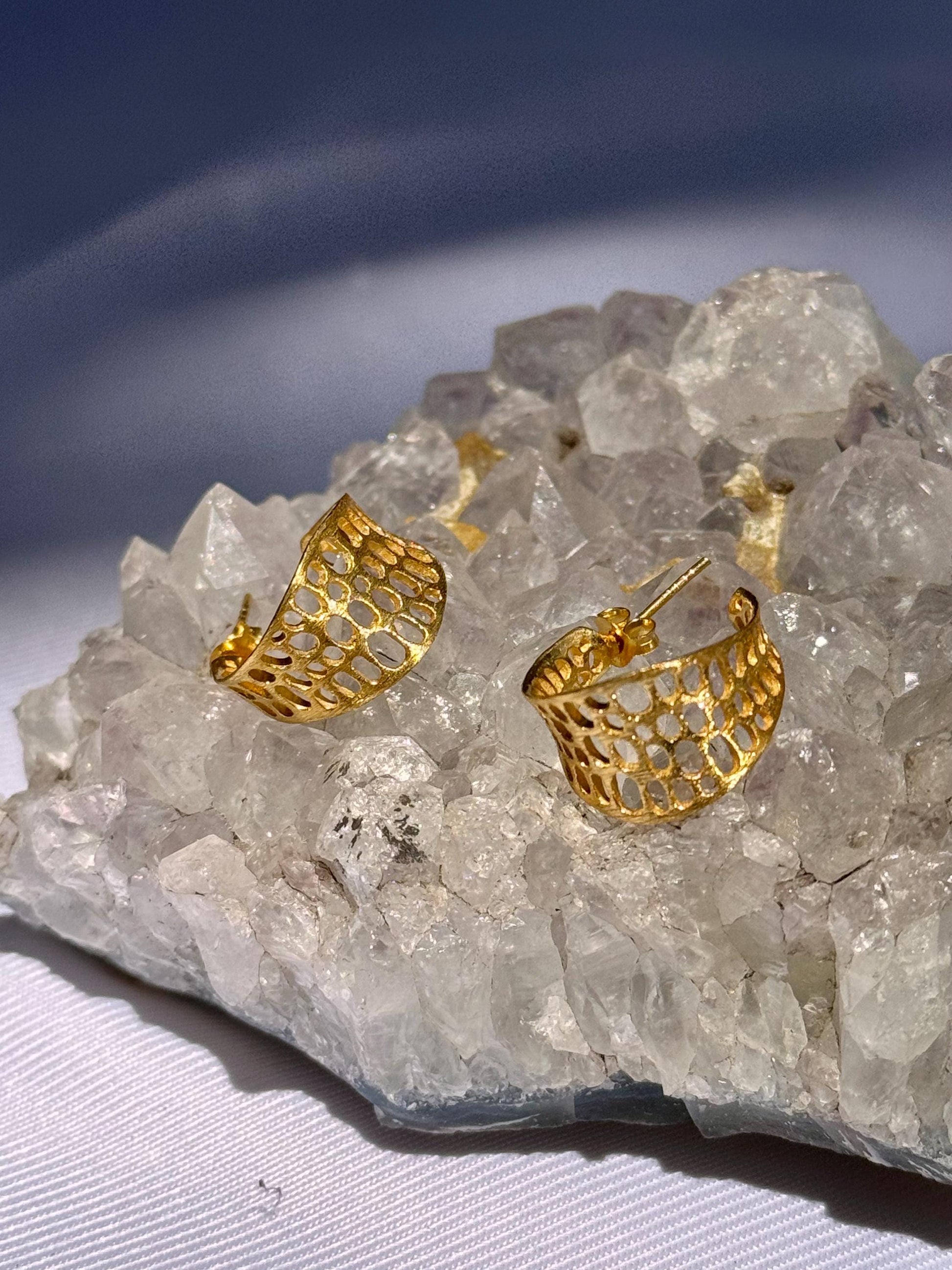 Elevate your style with these elegant 22k gold-plated hoop earrings, crafted with premium 925 sterling silver. These unique hoops feature an intricately designed openwork pattern, creating a light, airy feel while maintaining a bold, sophisticated look. With a modern, curved shape, they perfectly balance contemporary design with timeless elegance.